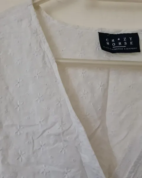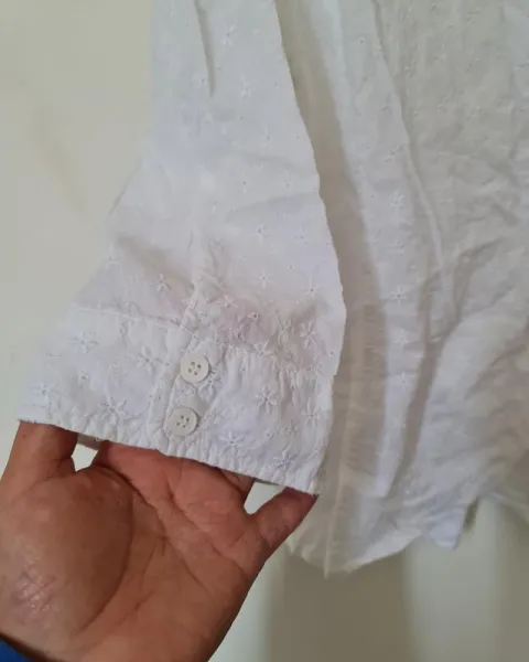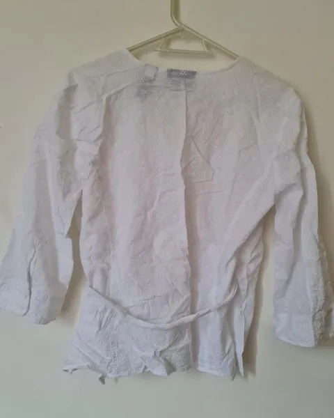 BLUSA BLANCA BORDADA!!CRUZADA!!. HERMOSA BLUSA BLANCA MANGA 3/4 CON BOTONSITOS !! ESTILO CRUZADO Y AMARRE LATERAL!! DISEÑO MUY ORIGINAL!! TELA BORDADOS!! Algodon fresco!!queda un lindo escote en "V"!! Incluye aretes ondeados fantasia!!
