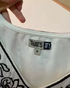 Blusa blanca con detalles en negro y cuello en v. Hombros angostos.Tela muy cómoda, de muy buena calidad.