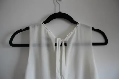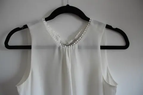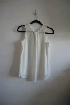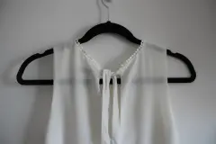 Blusa blanca, sin mangas, se abrocha con nudo por la parte de atrás y tiene lindo semi escote en la espalda. Marca Hollyland, talla ECh. Mide 46cm de axila a axila y 63cm de largo aprox.