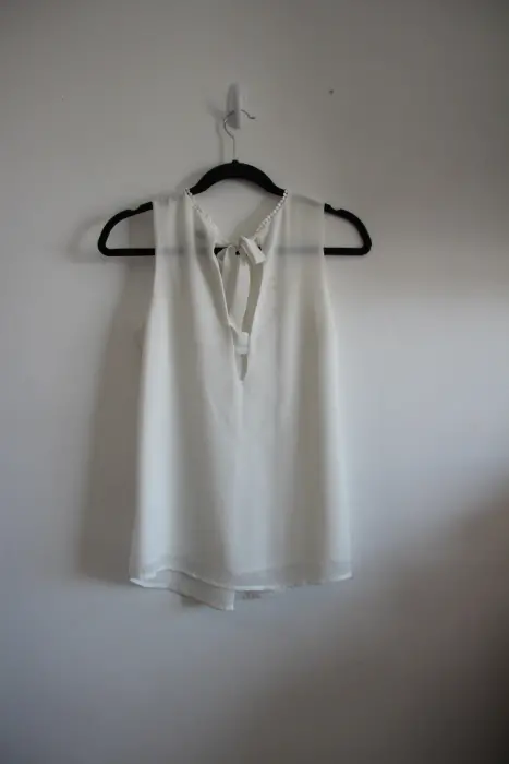 Blusa blanca con escote en espalda. Blusa blanca, sin mangas, se abrocha con nudo por la parte de atrás y tiene lindo semi escote en la espalda. Marca Hollyland, talla ECh. Mide 46cm de axila a axila y 63cm de largo aprox.
