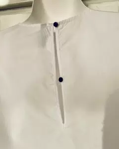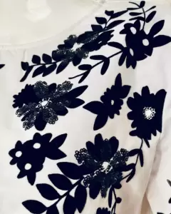 Blanca de manga larga con flores negras en terciopelo y lentejuelas. Trae resorte en las mangas para mejor ajuste.
