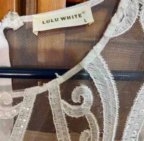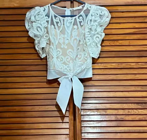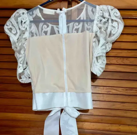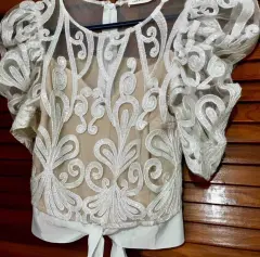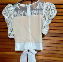 Blusa elegante de vestir con lentejuelas color blanco y fondo nude cierre en la espalda,con listón amarrada en la cintura,dice talla L pero viene reducida.Mangas abullonadas.Precio fijo