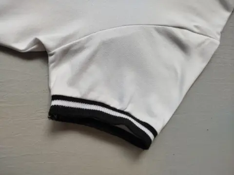 Es de tela suave, delgada y fresca, tiene una bolsita pequeña enfrente y rayas negras en cuello y mangas.