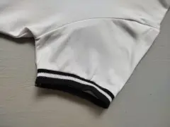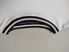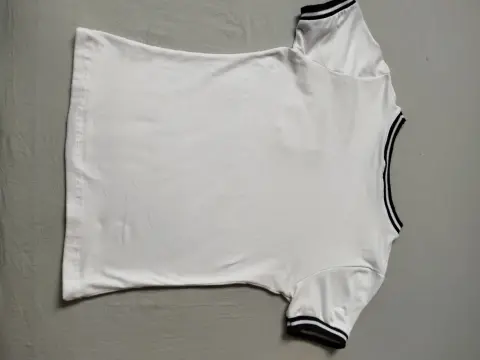Blusa blanca con negro. Es de tela suave, delgada y fresca, tiene una bolsita pequeña enfrente y rayas negras en cuello y mangas.