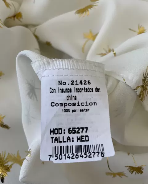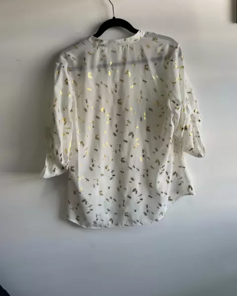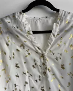 Blusa talla M, color blanco con estampado dorado y botones dorados, mide 46cm de hombros, 57cm de axilas, 63cm de largo y 42cm de manga.