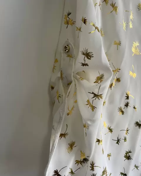 Blusa blanca con palmeras doradas. Blusa talla M, color blanco con estampado dorado y botones dorados, mide 46cm de hombros, 57cm de axilas, 63cm de largo y 42cm de manga.