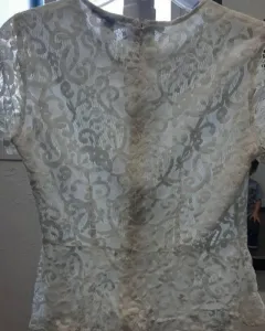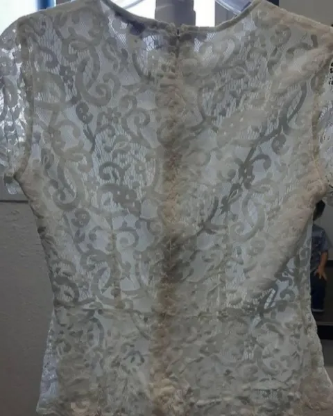 Blusa blanca de encaje, cuello redondo, manga corta, tiene un forrito que evita transparencia. Talla S y sin detalles.