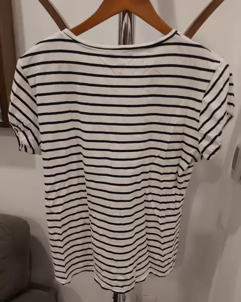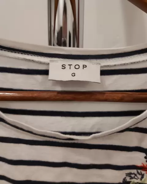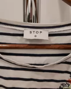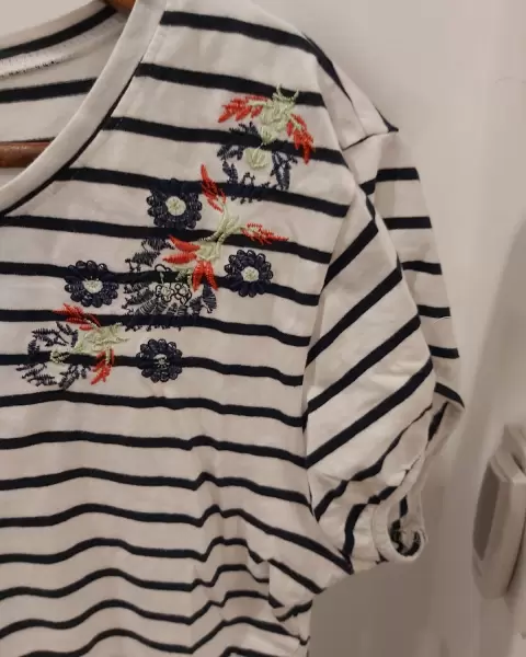 Blusa blanca de rayitas. Blusa blanca de rayas azul marino con bordados de flores multicolor en los hombros Manga corta