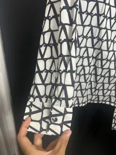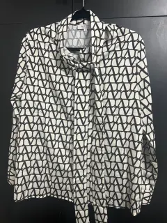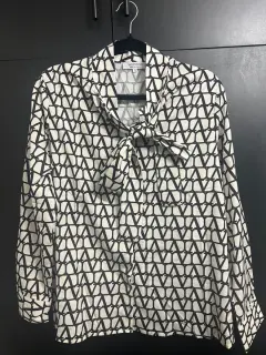 Blusa blanca con decorado de letras V, tela fresca delgadita, con tipo bufanda. Talla M