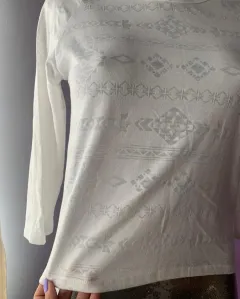 Preciosa blusita, manga 3/4, cuello redondo talla chica. Sus medidas son: 52cm largo, 43cm de axila a axila y 50cm de manga.
