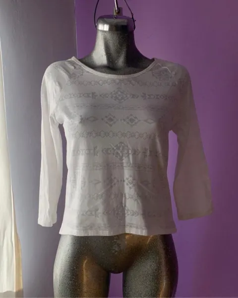 Blusa blanca manga 3/4. Preciosa blusita, manga 3/4, cuello redondo talla chica. Sus medidas son: 52cm largo, 43cm de axila a axila y 50cm de manga.