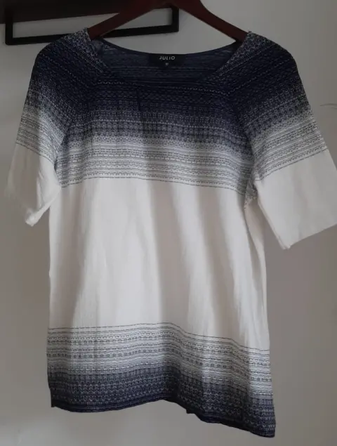 Blusa blanca y azul. Blusa manga corta, color blanco y azul marino, combinable con todo.Prácticamente nueva, marca Julio talla 10, amplia, tela suave y muy cómoda.
