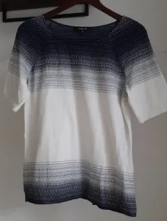 Blusa manga corta, color blanco y azul marino, combinable con todo.Prácticamente nueva, marca Julio talla 10, amplia, tela suave y muy cómoda.