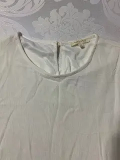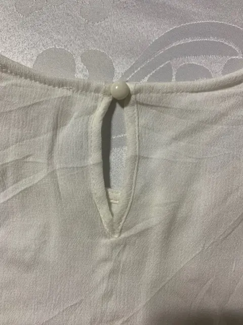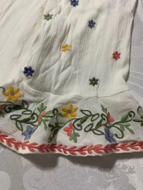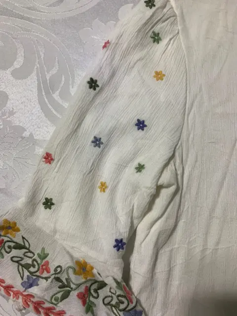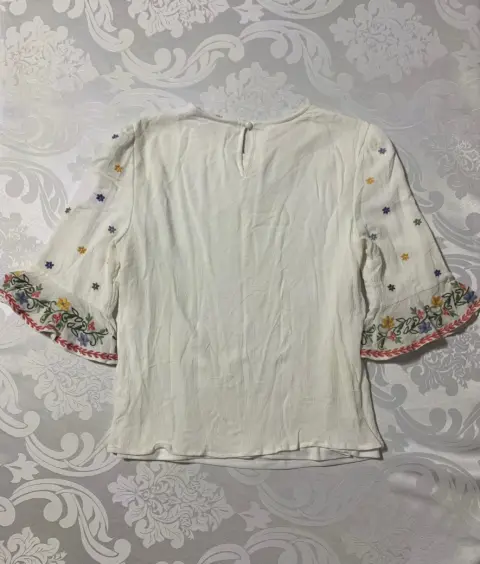Blusa de cuello redondo, manga 3/4 terminando en campana bordada con flores.Medidas/ busto: 42 cm, cintura: 40, largo: 55 cm, largo de mangas: 35 cm.
