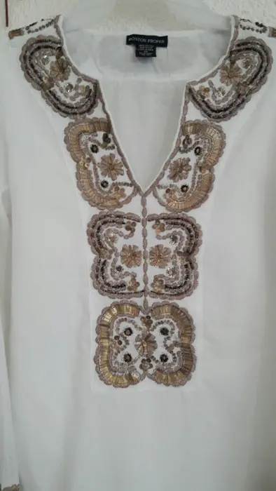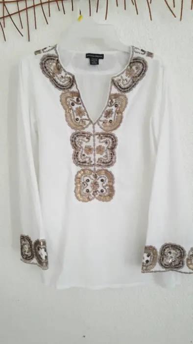 Blusa bordada. Hermosa blusa bordada en mangas y cuello con detalles en tonos dorados, fresca y Bohemia