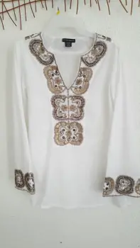 Hermosa blusa bordada en mangas y cuello con detalles en tonos dorados, fresca y Bohemia