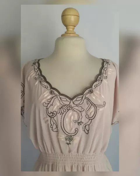 Blusa Bordada con Aplique Bisutería. Blusa ligera color PALO DE ROSA c/bordado tono GRIS MARENGO, cuello joya, manga hombro caido y aplique bisutería color PALO DE ROSA/PLATA BRILLANTE en zona frontal y elástico en cintura p/mejor ajuste. Talla L. Dimensiones cms: 52 hombro, 65 axila, 37 cintura (da hasta 56), 59 zona baja, 71 largo, 12 largo manga. 97% poliéster, 3%"spandex. Para lavado en casa.***SIN DETALLES, SE USO SOLO UNA VEZ***SE ENTREGA LAVADA Y DEODORIZADA***