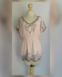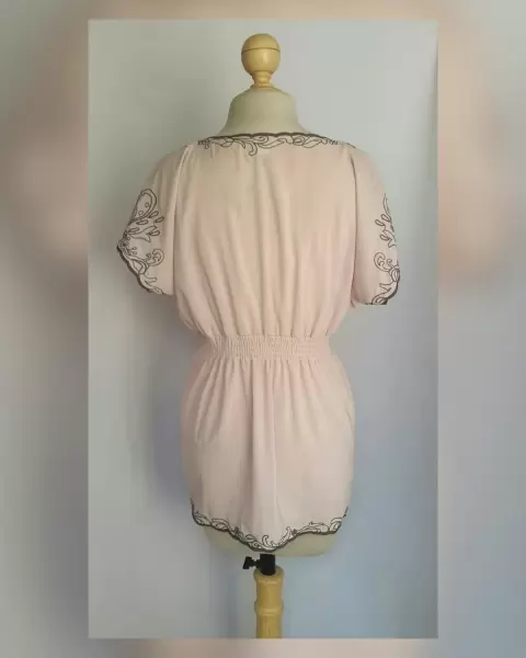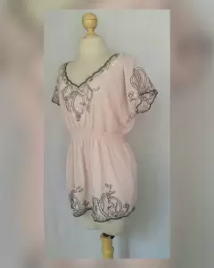 Blusa ligera color PALO DE ROSA c/bordado tono GRIS MARENGO, cuello joya, manga hombro caido y aplique bisutería color PALO DE ROSA/PLATA BRILLANTE en zona frontal y elástico en cintura p/mejor ajuste. Talla L. Dimensiones cms: 52 hombro, 65 axila, 37 cintura (da hasta 56), 59 zona baja, 71 largo, 12 largo manga. 97% poliéster, 3%"spandex. Para lavado en casa.***SIN DETALLES, SE USO SOLO UNA VEZ***SE ENTREGA LAVADA Y DEODORIZADA***