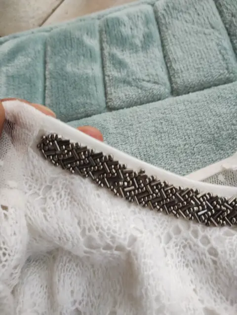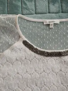 Blusa bordada encaje manga larga. Blusa tipo suéter tejida delgadaCon detalle de transparencia en espalda y brazosLindo detalle en el cuello de chaquiras plateadasFondo ligeroUsada una vez sin detalleTalla S y queda también a MMide 42 cm de hombro50 cm de axila63 cm de largo