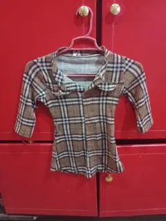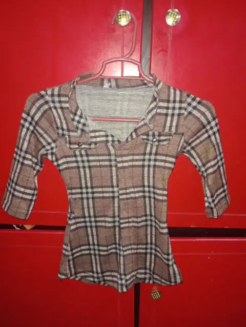 Blusa café niña. Blusa café con cuadros para niña de 5-7 años, tela suave, con trabillas para cinturón o cinta