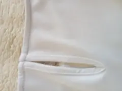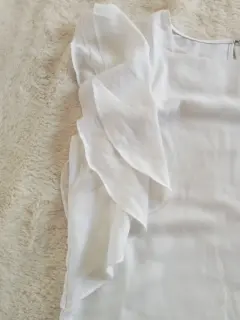 Blusa blanca talla S, marca Calvin Klein. Sin manga, solo con olanes. Cuello redondo y con cierre tipo oval en la parte de la espalda.