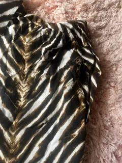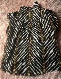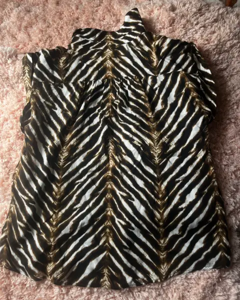 Es manga corta , talla chica , la tela tiene strech de axila a axila mide 45 de de largo 55 cm más lo que estira , el estampado es tipo animal print zebra en color café , tal cual las fotos
