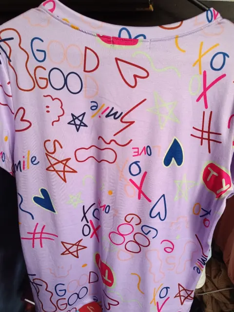 No tiene ningún detalle, es completamente nueva, es talla grande, queda pegada, es de tela fresca
