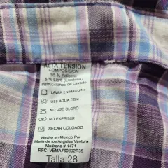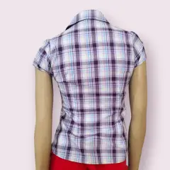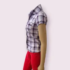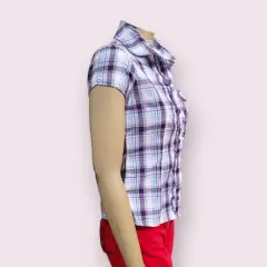 Blusa casual Alta Tension, talla 28, color morado con blanco en cuadros, manga corta bombacha, cuello en V, acento de olan, cierre de botones, bolsillo al frente, hecha de poliéster y licra, mide 35cm de hombro a hombro, 39cm de axila a axila 38cm de cintura con 55cm de largo del hombro hacia abajo en buen estado cosmetico