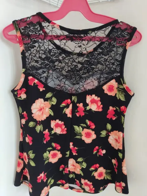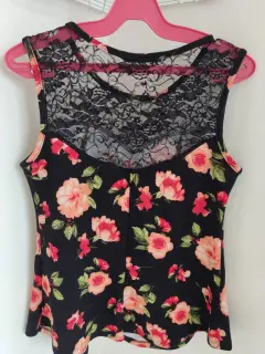 Bonita blusa negra con flores marca Vertiche, talla S. Con detalle de encaje en la parte superior, cuello circular.