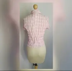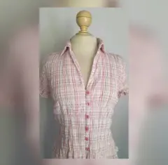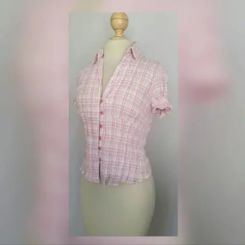 Blusa Casual efecto Corrugado. Blusa casual stretch a cuadros tonos BLANCO/ROSA PASTEL/AZUL, manga corta, c/tela corrugada, cuello V c/solapas, cierre p/botonadura, 66% algodón, 32% poliéster, 2% elastano, talla 11 (MUY REDUCIDA, da mejor a 7/9). Dimensiones cms: 37 hombro, 47.5 axila, 41 cintura, 45 zona baja. ***SIN DETALLES, se uso solo una vez por unas horas.***SE ENTREGA LAVADA Y DEODORIZADA***