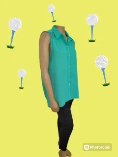 Blusa casual Metaphor. Blusa casual Metaphor, talla XL, color verde con de tables de encaje sofisticado, sin mangas, Cuello en V, con botones plateados al frente, Cola de pato con hermoso detalle de both dorados para darle un toque especial y elegante, hecha de poliéster, mide 38cm de hombro a hombro, 54cm de axila a axila, 53cm de cintura con 26cm de largo al frente y 82cm de largo de atras del hombro hacia abajo.