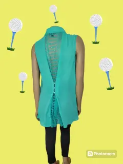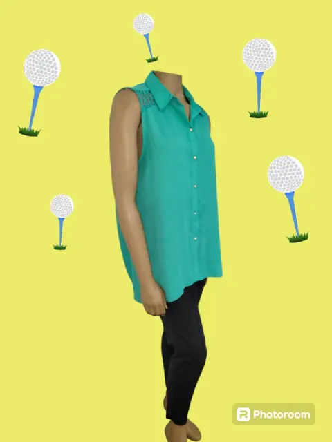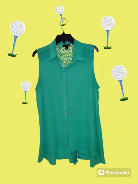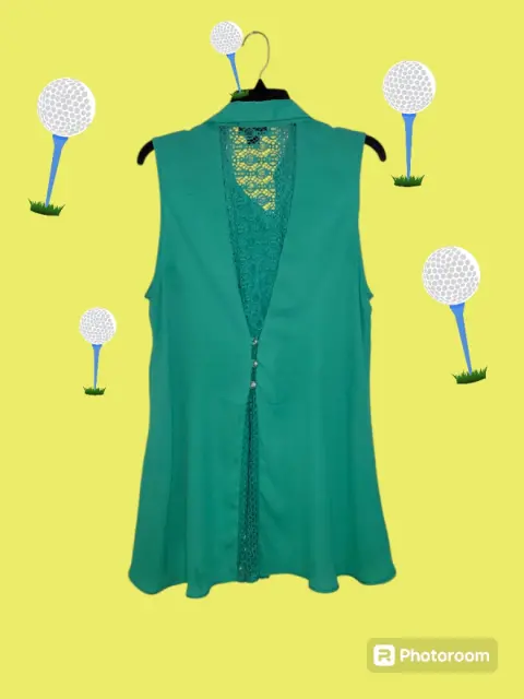 Blusa casual Metaphor, talla XL, color verde con de tables de encaje sofisticado, sin mangas, Cuello en V, con botones plateados al frente, Cola de pato con hermoso detalle de both dorados para darle un toque especial y elegante, hecha de poliéster, mide 38cm de hombro a hombro, 54cm de axila a axila, 53cm de cintura con 26cm de largo al frente y 82cm de largo de atras del hombro hacia abajo.