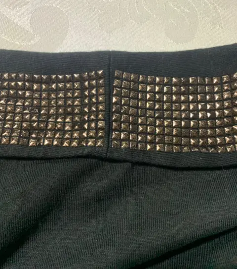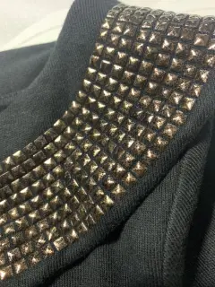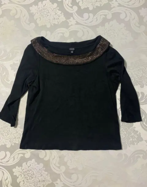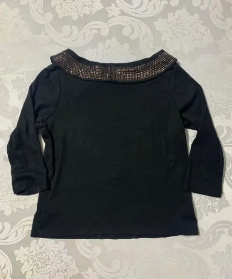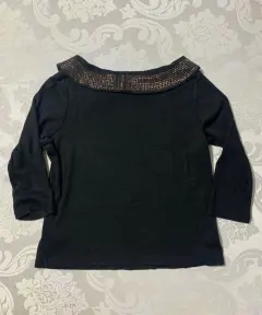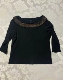 Blusa petite, de manga 3/4, con decorado de estoperoles, tela de algodón.Medidas/ busto: 47 cm, cintura: 46 cm, largo: 54 cm, largo de mangas: 43 cm