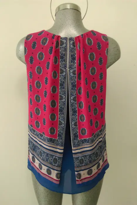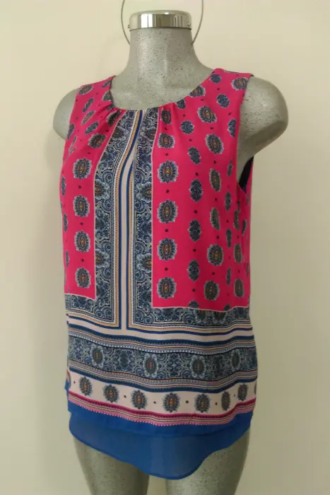 Blusa casual Rose& Olive. Talla MedianaEs una blusa de estilo casual con diseño de escote redondo, sin mangas con terminado en corte U. Fruncido desde escote. Simula dos piezas y abertura trasera.De hermosos colores intensos en tonos azul y rosaTela suave 100% poliéster. No AjustableMarca Rose& OliveTalla MedianaPecho 52 cmAxila/axila 104 cmCintura 100 cmLargo 71 cm