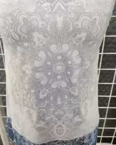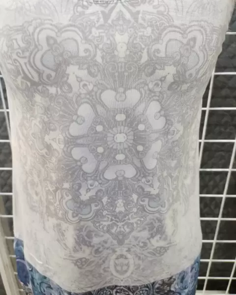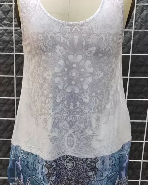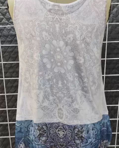Blusa sin mangas, cuello redondo, tela fresca, ideal para días de primavera y verano, llega abajo de los glúteos, talla L, color gris gaspeadoMedidas:Axila a axila 43cmLargo hombro a axila 22cmLargo hombro a cintura 73 cm