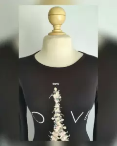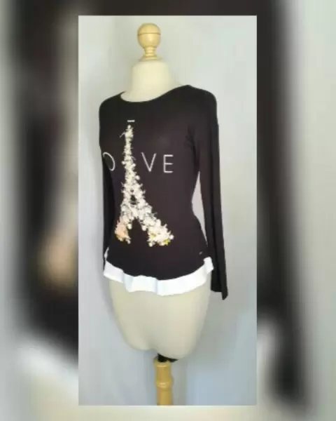 Blusa ligera estilo peplum bitono NEGRO ÉBANO/BLANCO POLAR c/estampado multicolor, cuello redondo y manga larga. Talla M. Dimensiones cms: 44 hombro, 47 axila, 41 cintura, 52 zona baja, 65 largo, 58 largo manga. 96% viscosa, 4% elastano. P/lavado en casa.***P/LA COMPOSICIÓN DE LA PRENDA ES STRETCH PERO SIN SUBIR A LA SIG TALLA***