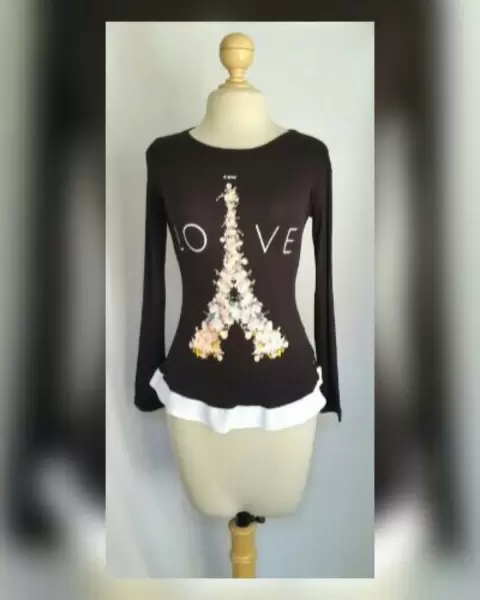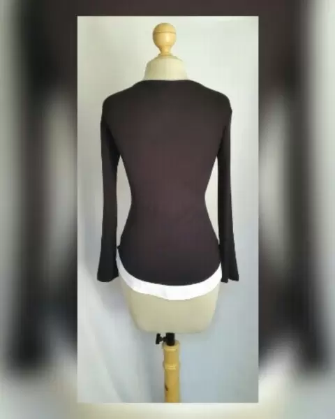 Blusa c/Estampado estilo Peplum. Blusa ligera estilo peplum bitono NEGRO ÉBANO/BLANCO POLAR c/estampado multicolor, cuello redondo y manga larga. Talla M. Dimensiones cms: 44 hombro, 47 axila, 41 cintura, 52 zona baja, 65 largo, 58 largo manga. 96% viscosa, 4% elastano. P/lavado en casa.***P/LA COMPOSICIÓN DE LA PRENDA ES STRETCH PERO SIN SUBIR A LA SIG TALLA***
