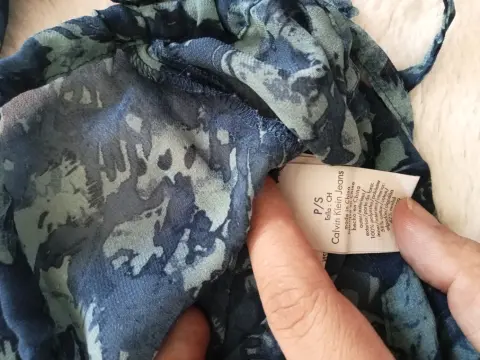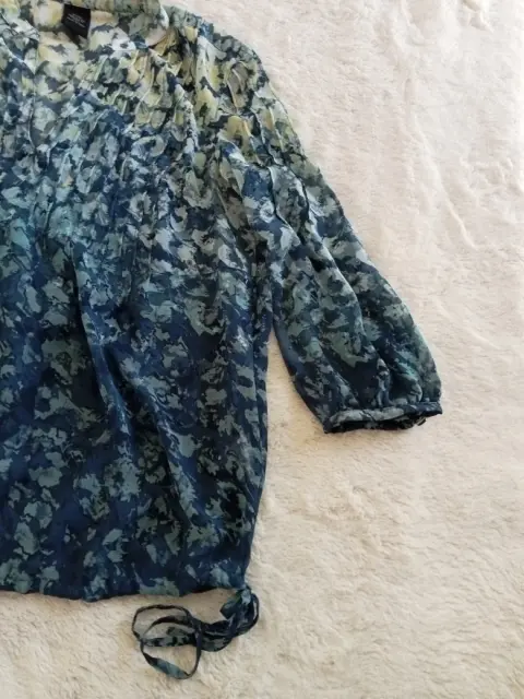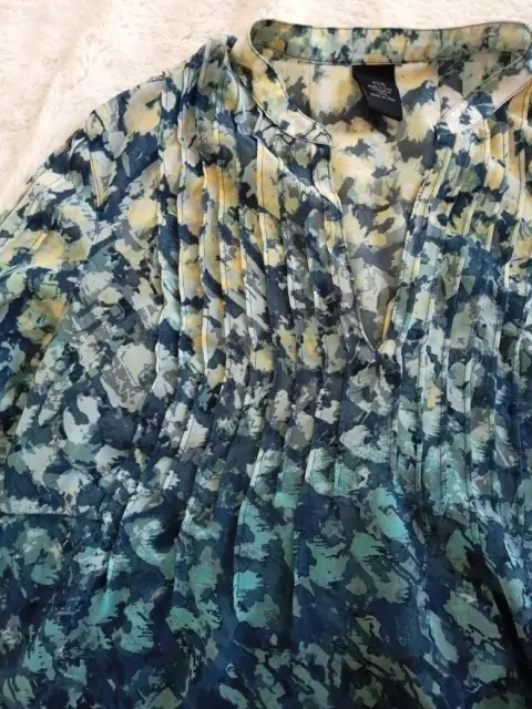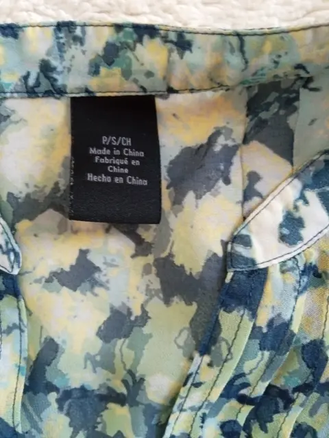 Blusa azul, degrada en 2 tonos de azul y un amarillo. Jareta en la cintura y en las mangas 3/4. Olanes pequeños en el pecho. Talla S, marca Calvin Klein.