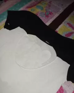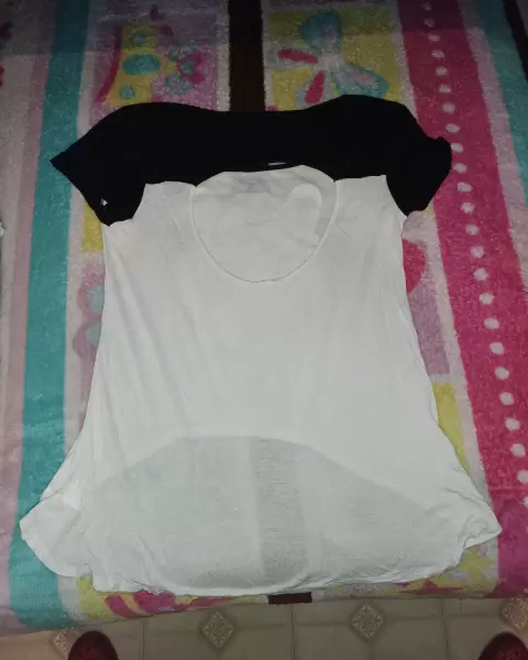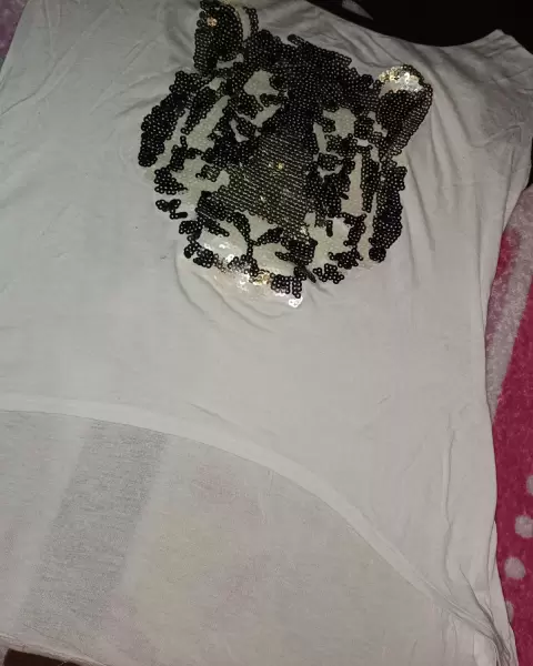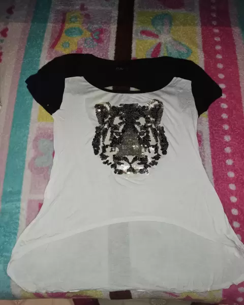 Blusa color negro con blanco, de manga cortita, en la parte de enfrente cuenta con un tigre de lentejuela, en la parte de atras trae un escote redondo, esta blusa esta hermosa