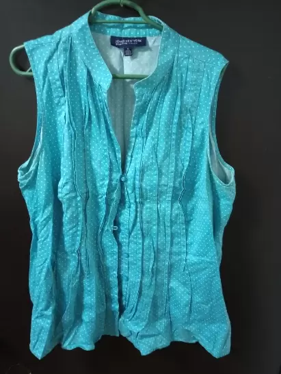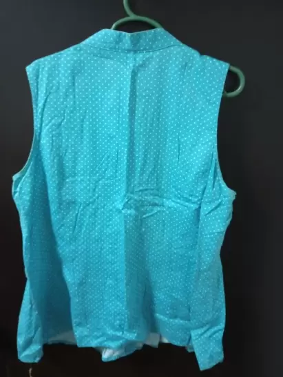 Blusa color azul con bolitas blanca 1X. Blusa de liverpool sin manga perfecta para usar con jean o pantalón formal, de tele muy fresca y cómoda