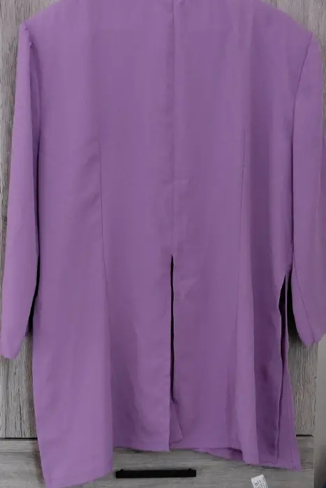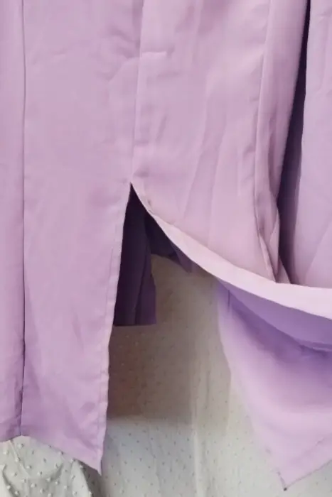 Blusa ideal para darle el estilo que quieras!Color lavanda manga largaNo tiene etiquetas. Queda para tallas entre M y LCuenta con abertura al frente y en la parte de atrás para que le des el estilo que quieras.→Defecto: En uno de los botones se le está desprendiendo el forro de tela con el que cuenta,