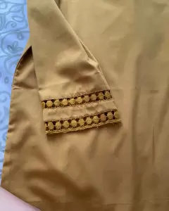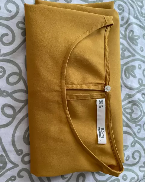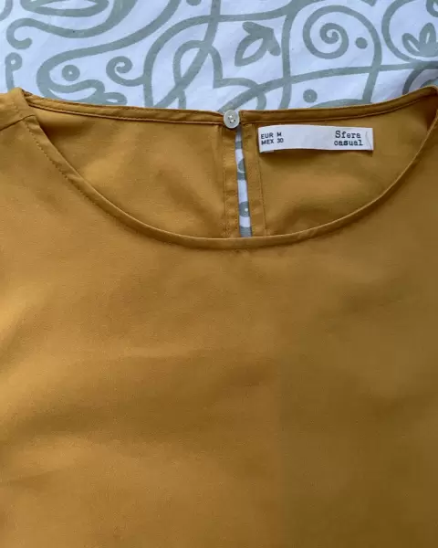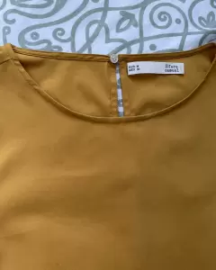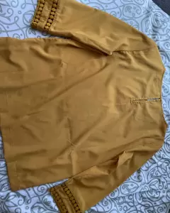 Blusa color mostaza con encaje en manga. Una blusa ligera y su color es hermoso, se ha usado realmente muy poco, no tiene ningún detalle todo está en perfectas condiciones. Las medidas son: Hombro 37cm, axila a axila 47.5, largo 62cm, contorno manga 26cm, largo manga 45cm