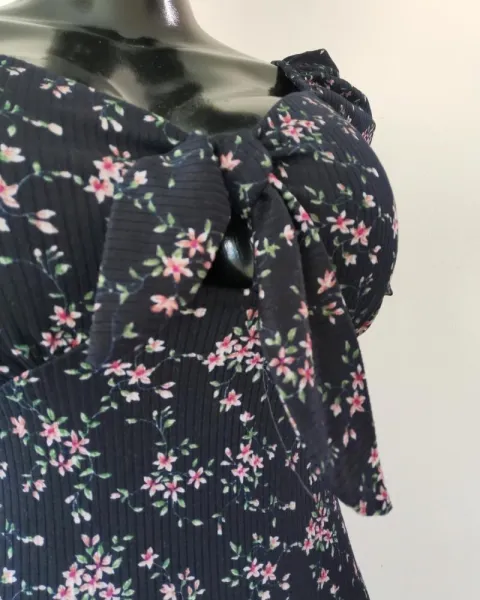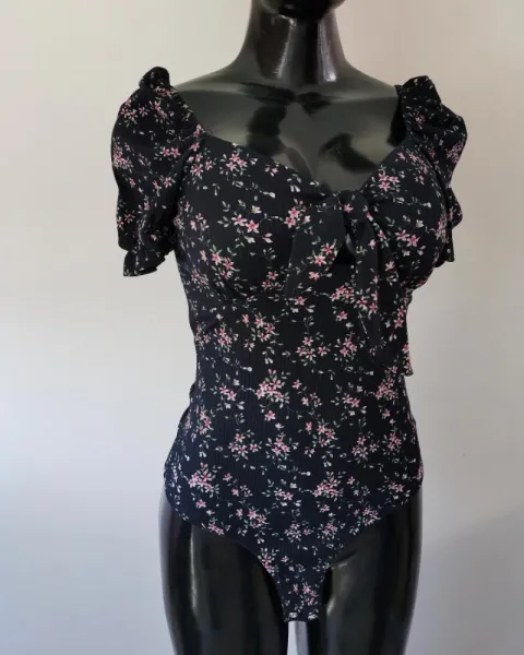 Blusa Color Negro Con Estampado De Flores. Body negro con manga corta, la tela es super suave, tiene escote enfrente pero con el moño que trae el body casi no se nota, este body es talla chica, pero si gustas en otra talla y otro color (como los que están en mi closet) podemos checar lo así que pregunta sin compromiso