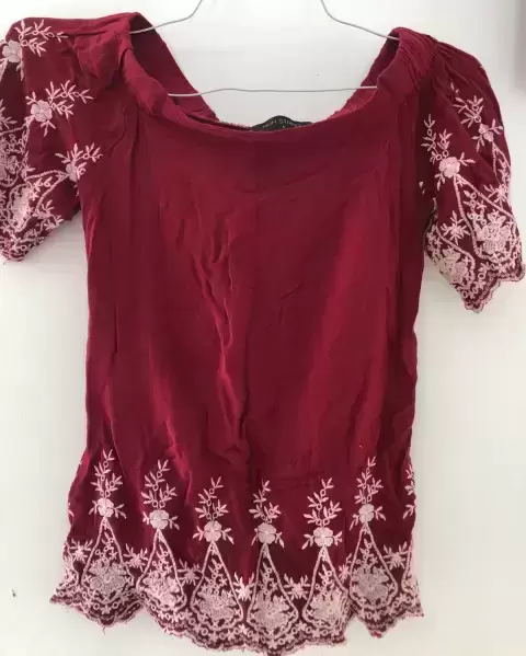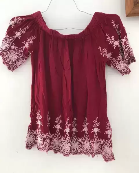 Blusa color tinto con bordado en manga. Hermosa blusa de algodón color tinto, con manga bordada y a la orilla de laBlusa, tiene elástico en losHombros para un bonito ajuste marca High Street talla S