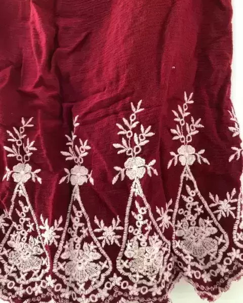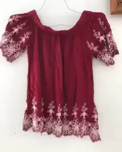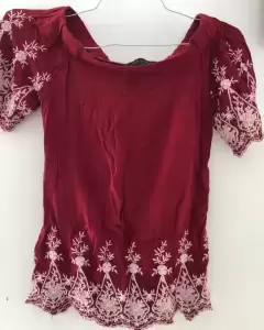Hermosa blusa de algodón color tinto, con manga bordada y a la orilla de laBlusa, tiene elástico en losHombros para un bonito ajuste marca High Street talla S