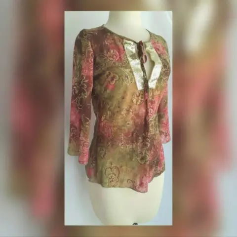 Blusa con Aplique Lentejuela. Blusa c/transparencias multicolor en tonos morados, rosas, verdes, vino y flores de hilos dorados, tiene lentejuela dorada cosida al frente de la blusa, cuello redondo, manga 3/4. Talla G (MUY REDUCIDA, DA MEJOR A TALLA S). Dimensiones cms: 34 hombro, 46.5 axila, 43.5 cintura, 53 zona baja, 64 largo, 46 largo manga. 100% poliéster. NUEVA, NUNCA SE USO PORQUE NO ME QUEDÓ.