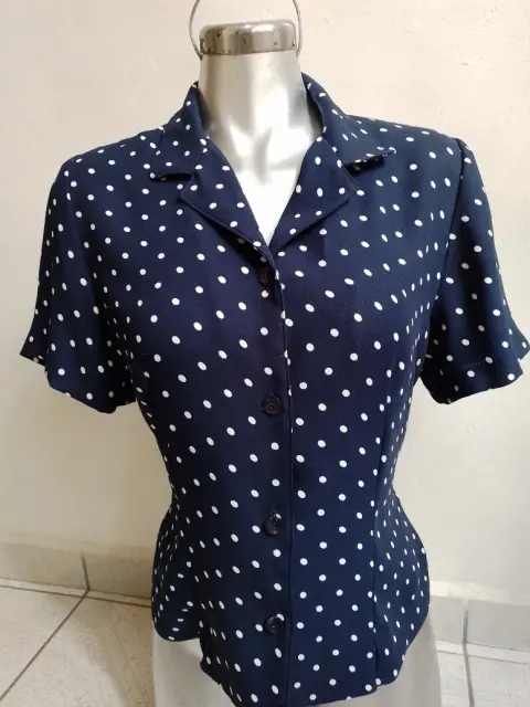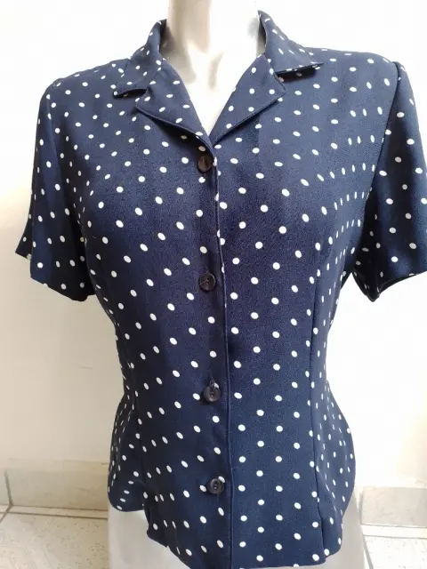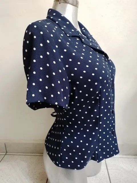 Blusa con bolitas. Linda blusa👚 color azul marino con bolitas blancas, con cintas de amarre, cuello v, botones al frente, una puesta, sin detalles, marca Sag Harbor, talla mediana, para armar un lindo outfit