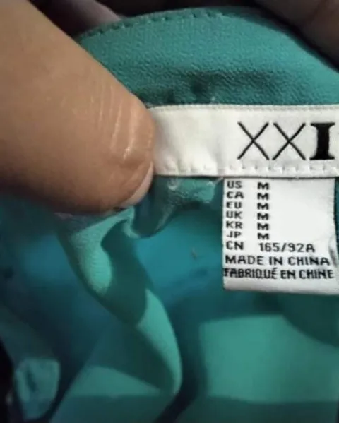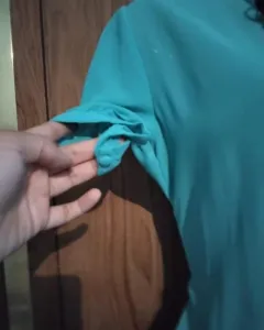 Blusa con cuellito y olanes de color menta, tiene 2 cordoncitos para formar un moño de color negro a la altura del cuello no estira mucho la tela y es fresca
