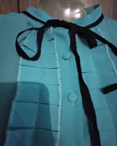 Blusa con cuellito y listones. Blusa con cuellito y olanes de color menta, tiene 2 cordoncitos para formar un moño de color negro a la altura del cuello no estira mucho la tela y es fresca