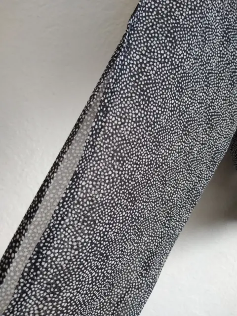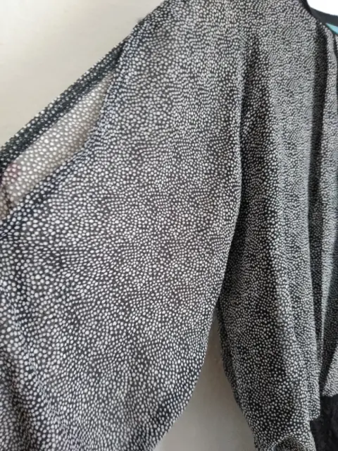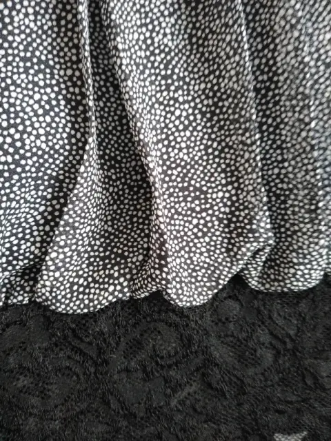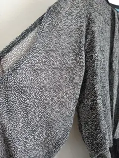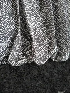 Blusa delgada, talla chica con encaje en la parte baja y al final de mangas, cuello redondo y pliegues al frente, manga larga con detalles de dos aberturas a lo largo de la parte externa de las mangas, color negro con puntos blancos, muy fresca